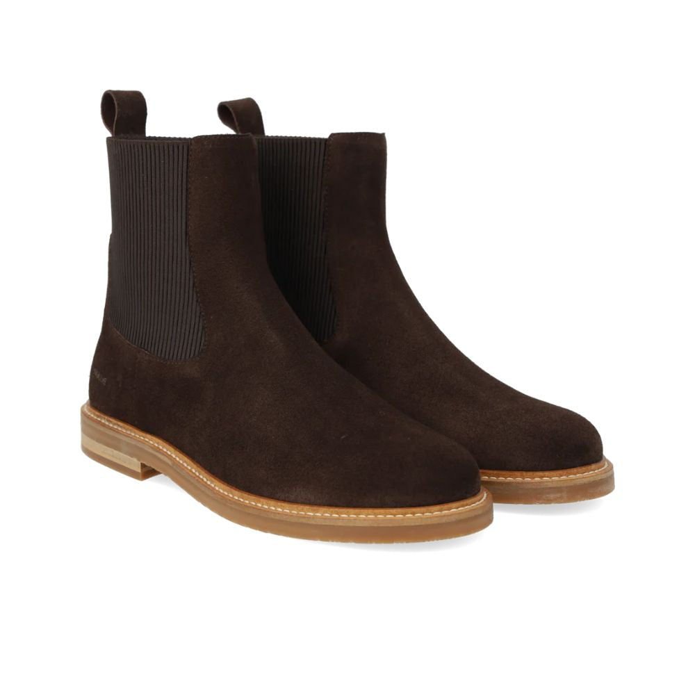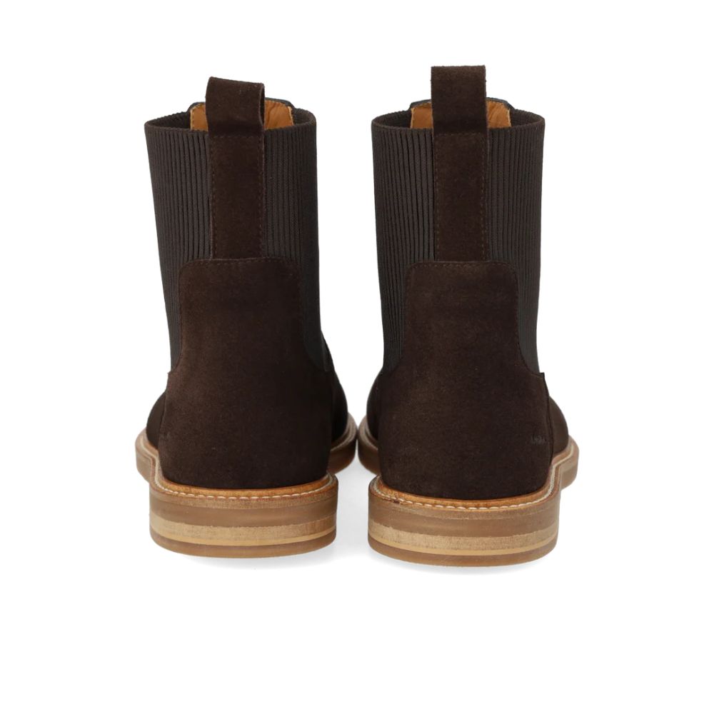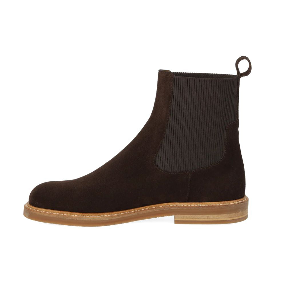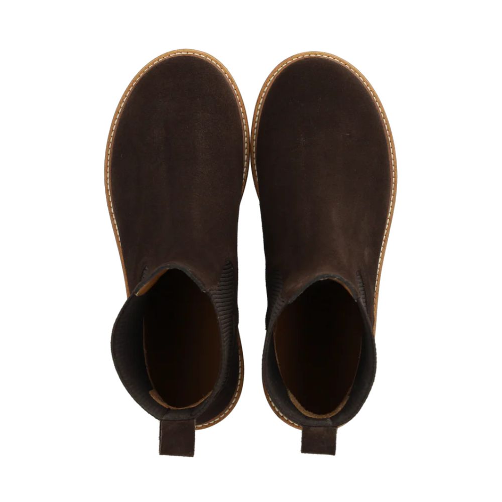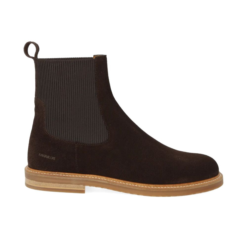 Klassisk Chelsea støvle med rummelig pasform i chokoladebrunt ruskind. Støvlen har en rundet snude, fast hælkappe, præget logo på siden, funktionel ribelastik langs siderne og bagpå for ekstra fleksibilitet samt hælstrop, der gør det nemt at få støvlen af og på, vatteret indersål, kromfrit læderfoer og en let, blød og fleksibel ANGULUS logo gummisål. Udformet i naturligt og åndbart skind. Designet i Danmark og håndlavet med kærlighed i Portugal.