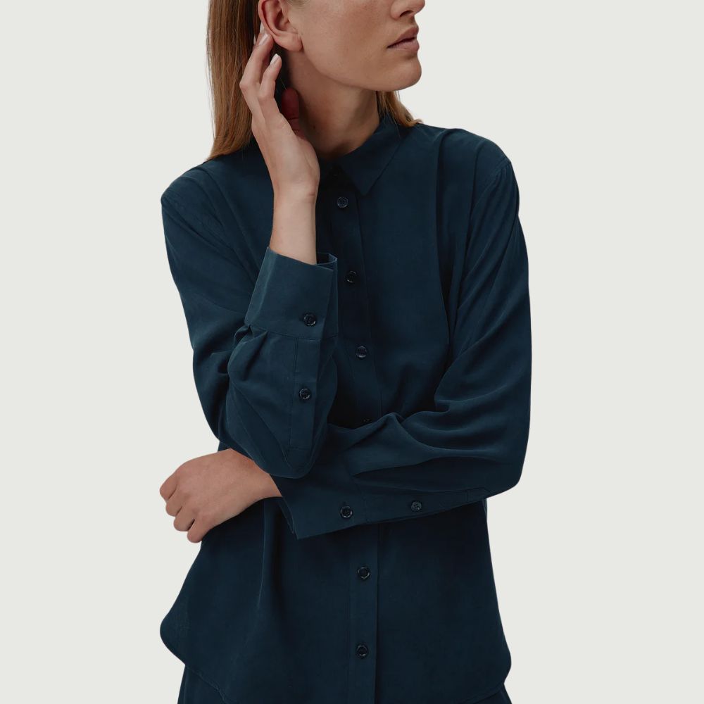 Den bløde silkekvalitet føles behagelig mod huden og falder let, hvilket gør Ally både alsidig og tidløs. Skjorten kan styles alene for et raffineret look eller bæres under strik for et mere afslappet, lag-på-lag udtryk – perfekt til både hverdag og mere formelle anledninger.